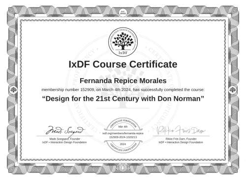This IxDF Membership Certificate is issued to Fernanda Repice Morales in formal recognition of their membership of the IxDF, global leader in design education.