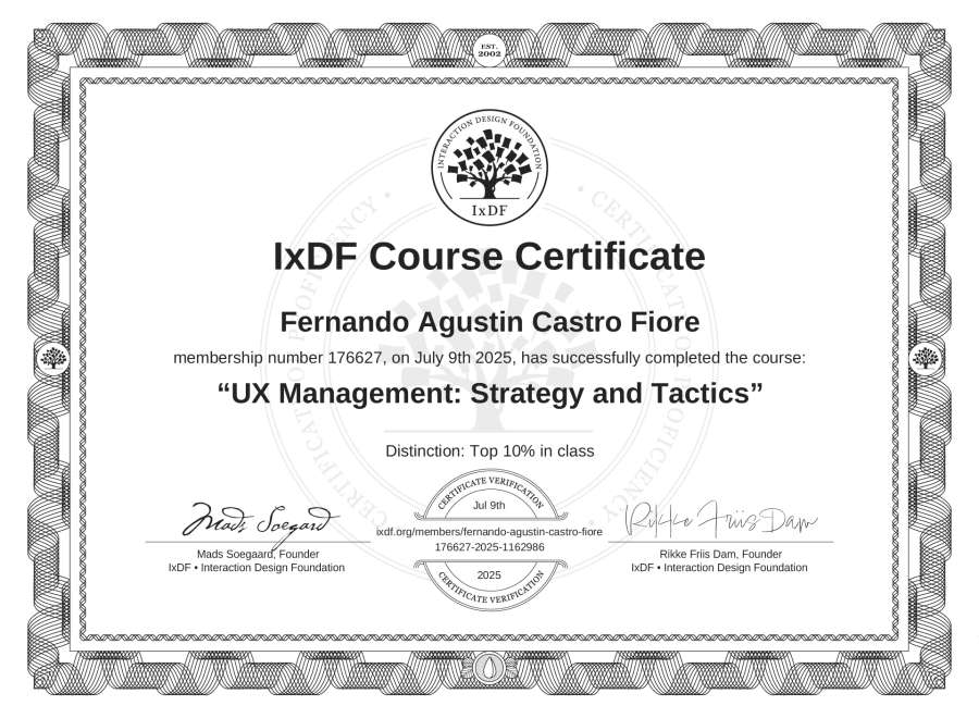 The IxDF Course Certificate above is awarded to Fernando Agustín Castro Fiore with a Top 10% Distinction in formal recognition of their coursework surpassing the rigorous benchmarks of exceptional performance established by the IxDF Educational Codex.