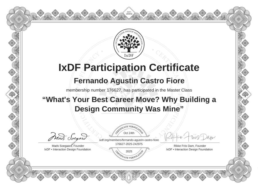 Fernando Agustín Castro Fiore's IxDF Masterclass Certificate: What's Your Best Career Move? Why Building a Design Community Was Mine