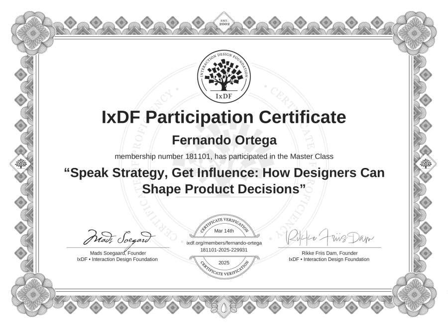 Fernando Ortega's IxDF Masterclass Certificate: Speak Strategy, Get Influence: How Designers Can Shape Product Decisions
