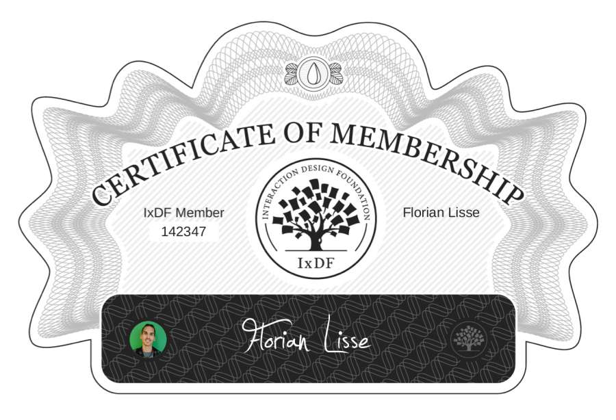 The Membership Certificate below verifies that Florian Lisse is a member of Interaction Design Foundation.