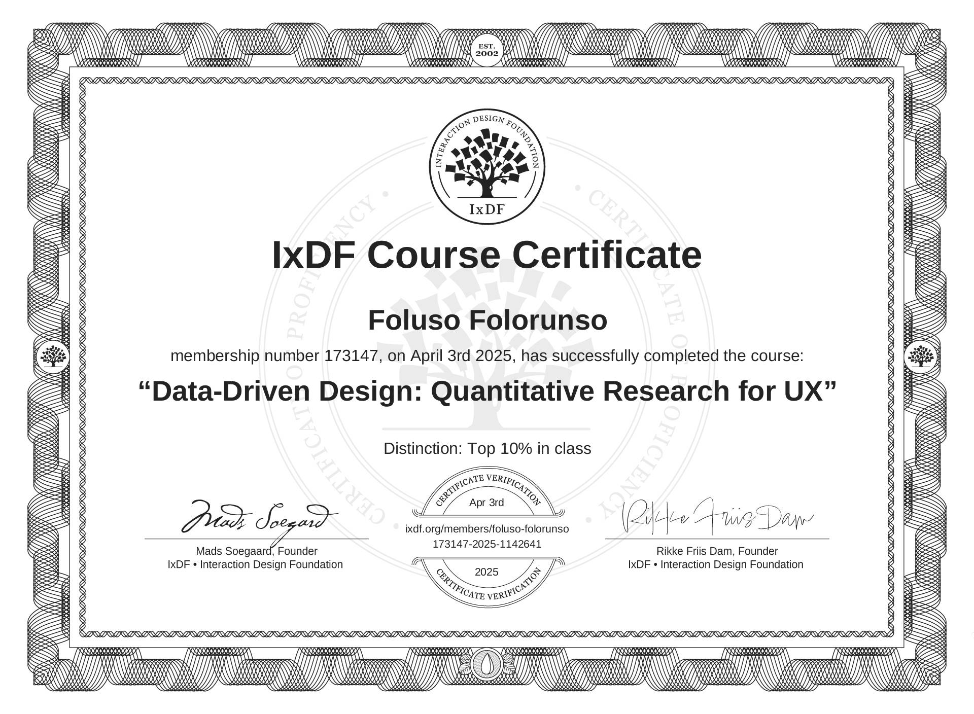 The IxDF Course Certificate above is awarded to Foluso Folorunso with a Top 10% Distinction in formal recognition of their coursework surpassing the rigorous benchmarks of exceptional performance established by the IxDF Educational Codex.