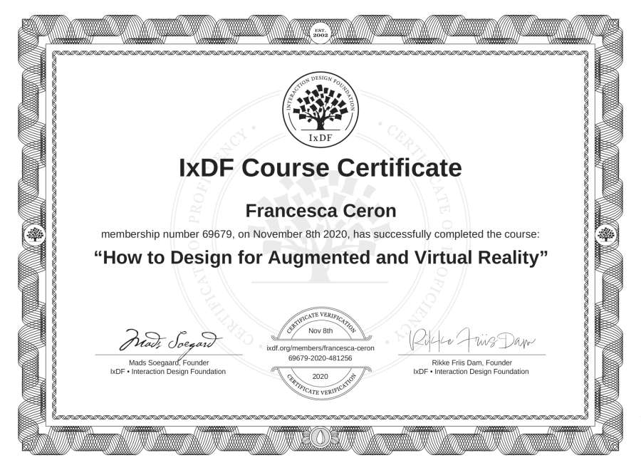 Francesca Ceron's IxDF Course Certificate: How to Design for Augmented and Virtual Reality