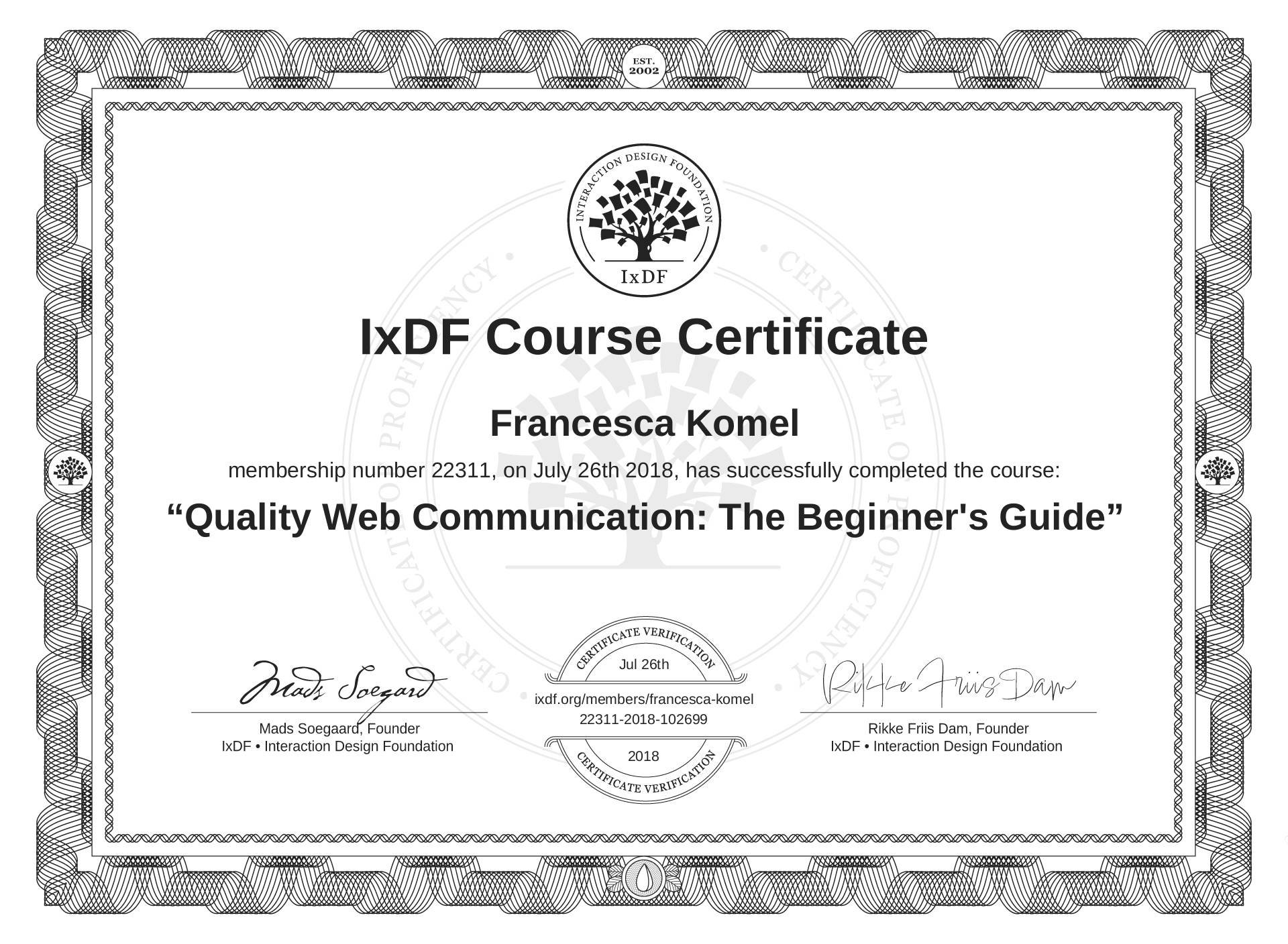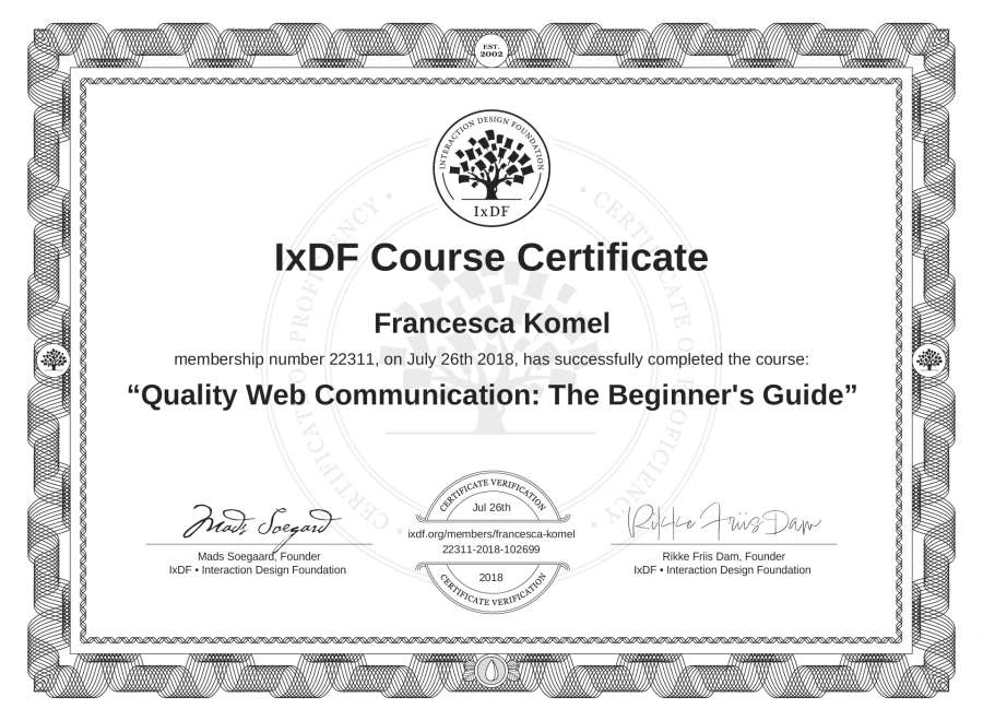 Francesca Komel's IxDF Course Certificate: Quality Web Communication: The Beginner's Guide
