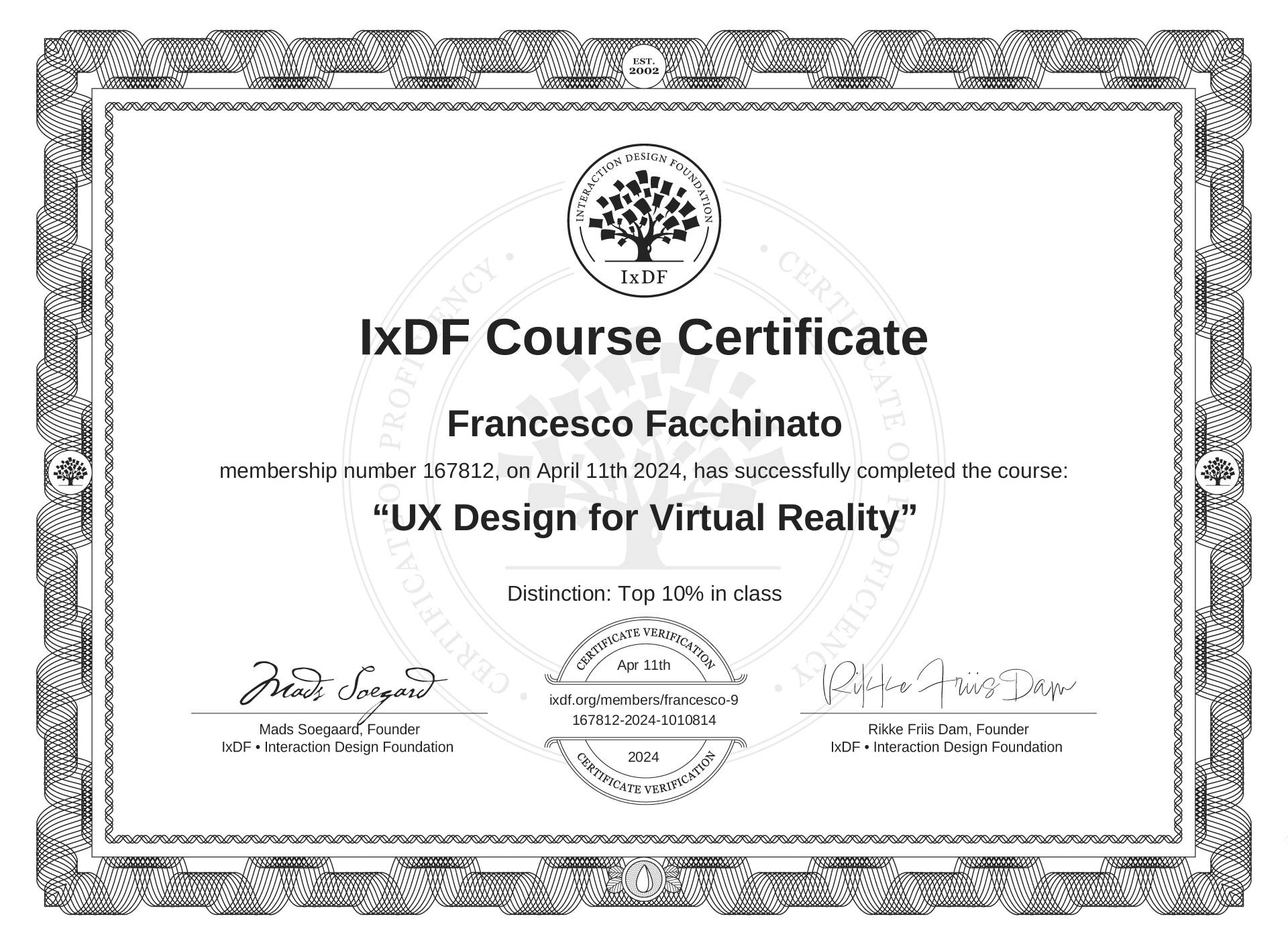 The IxDF Course Certificate above is awarded to Francesco Facchinato with a Top 10% Distinction in formal recognition of their coursework surpassing the rigorous benchmarks of exceptional performance established by the IxDF Educational Codex.
