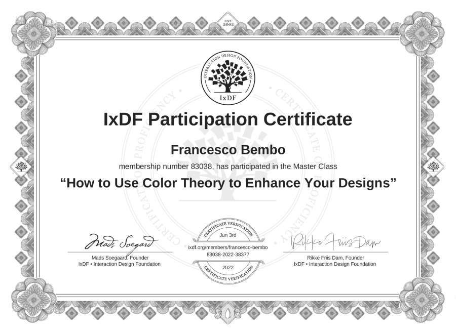 Francesco Bembo's IxDF Masterclass Certificate: How to Use Color Theory to Enhance Your Designs