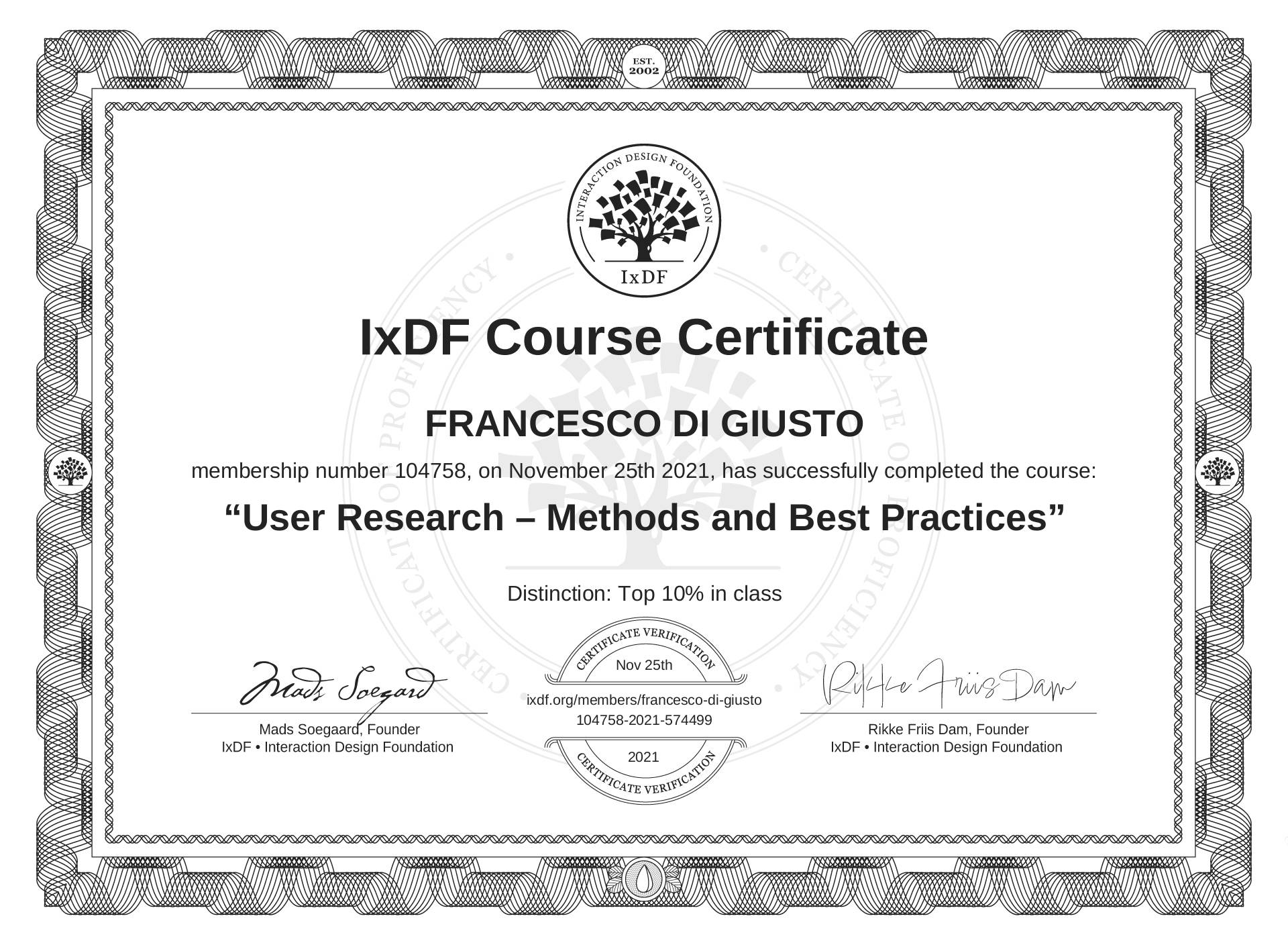 FRANCESCO DI GIUSTO's IxDF Course Certificate: User Research – Methods and Best Practices