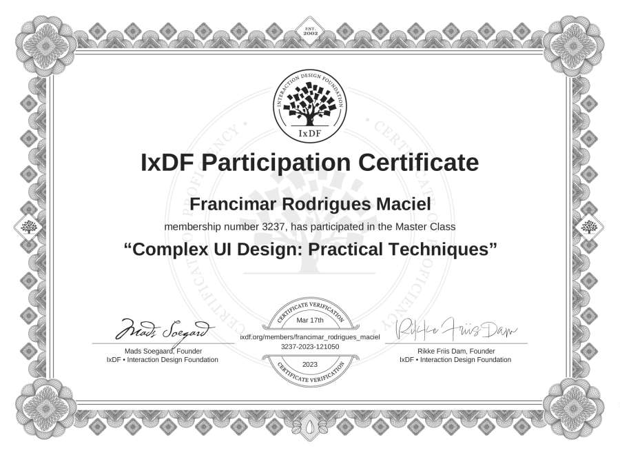 Francimar Rodrigues Maciel's IxDF Masterclass Certificate: Complex UI Design: Practical Techniques