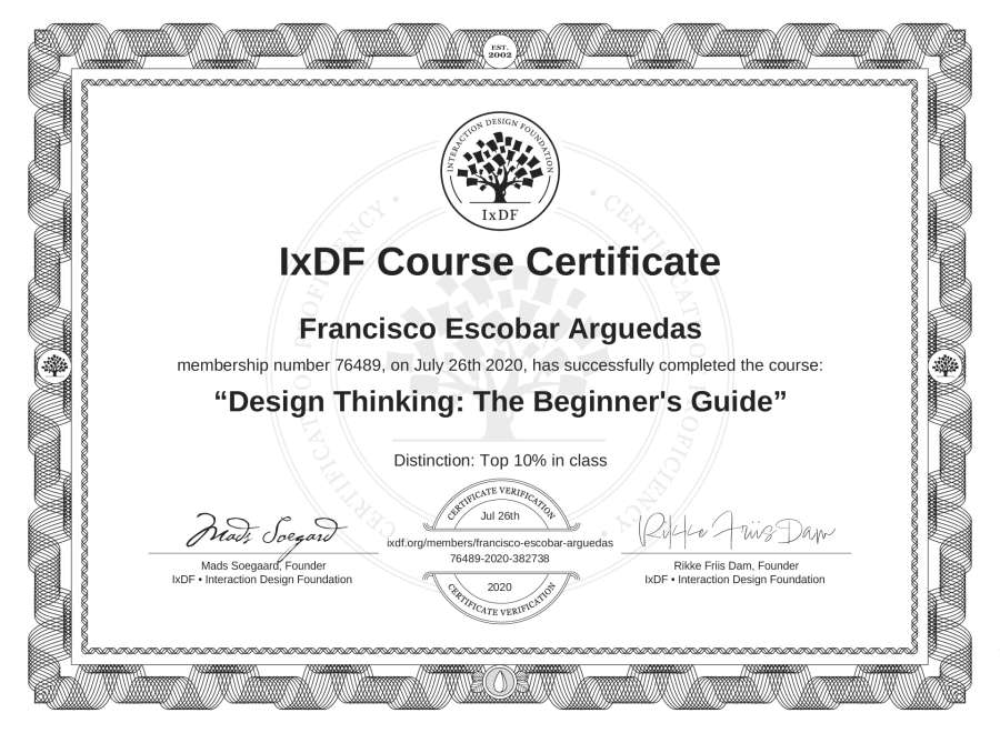 The IxDF Course Certificate above is awarded to Francisco Escobar Arguedas with a Top 10% Distinction in formal recognition of their coursework surpassing the rigorous benchmarks of exceptional performance established by the IxDF Educational Codex.