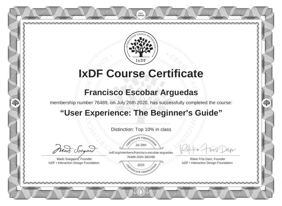 Francisco Escobar Arguedas's IxDF Course Certificate: User Experience: The Beginner's Guide