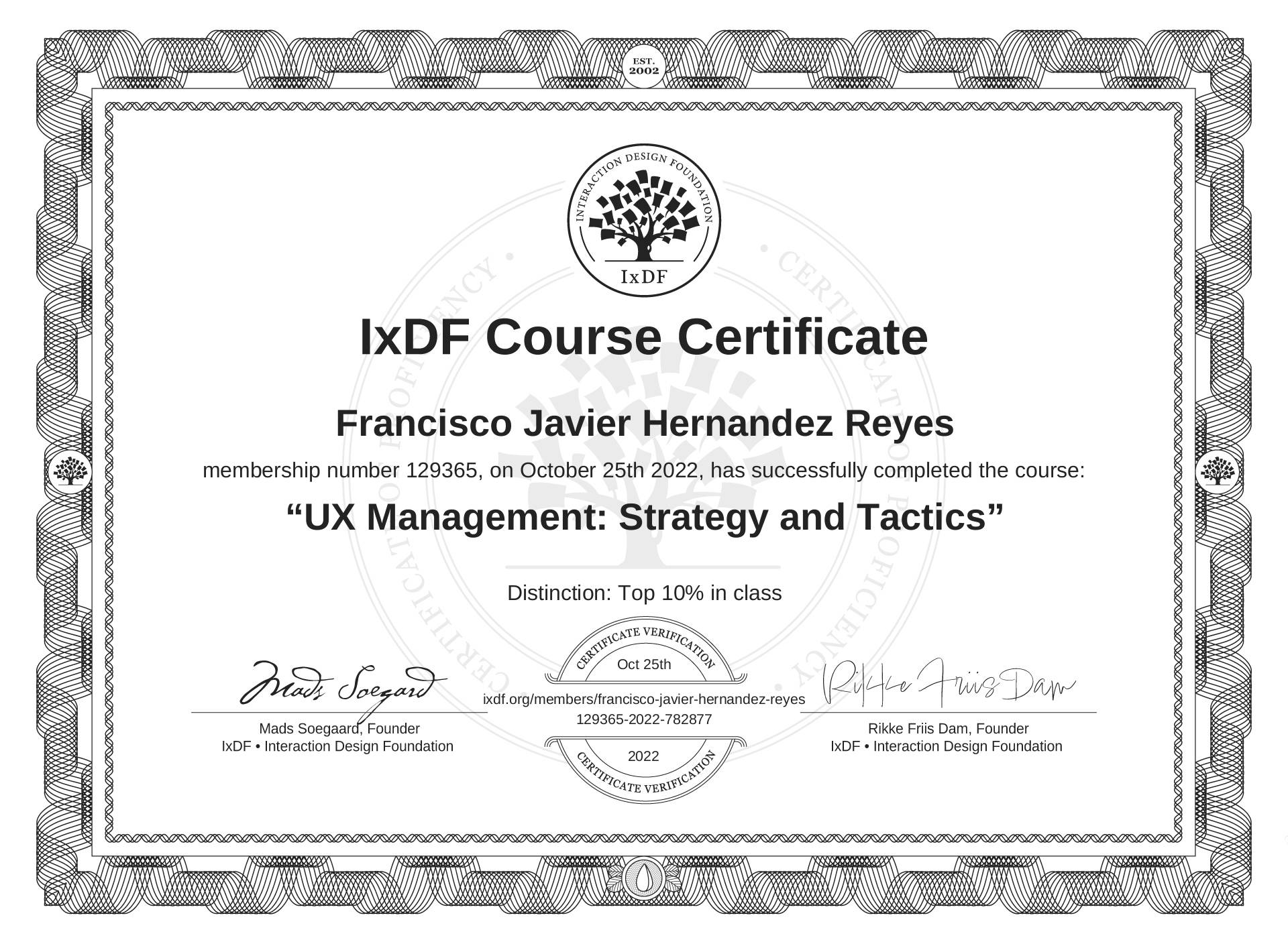 The IxDF Course Certificate above is awarded to Francisco Javier Hernández Reyes with a Top 10% Distinction in formal recognition of their coursework surpassing the rigorous benchmarks of exceptional performance established by the IxDF Educational Codex.