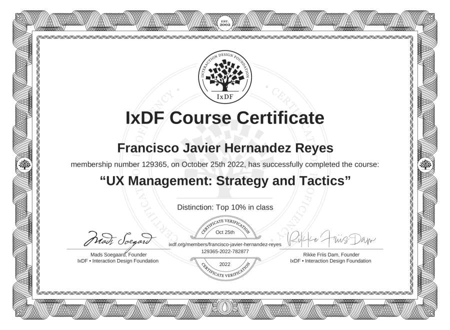 Francisco Javier Hernández Reyes's IxDF Course Certificate: UX Management: Strategy and Tactics