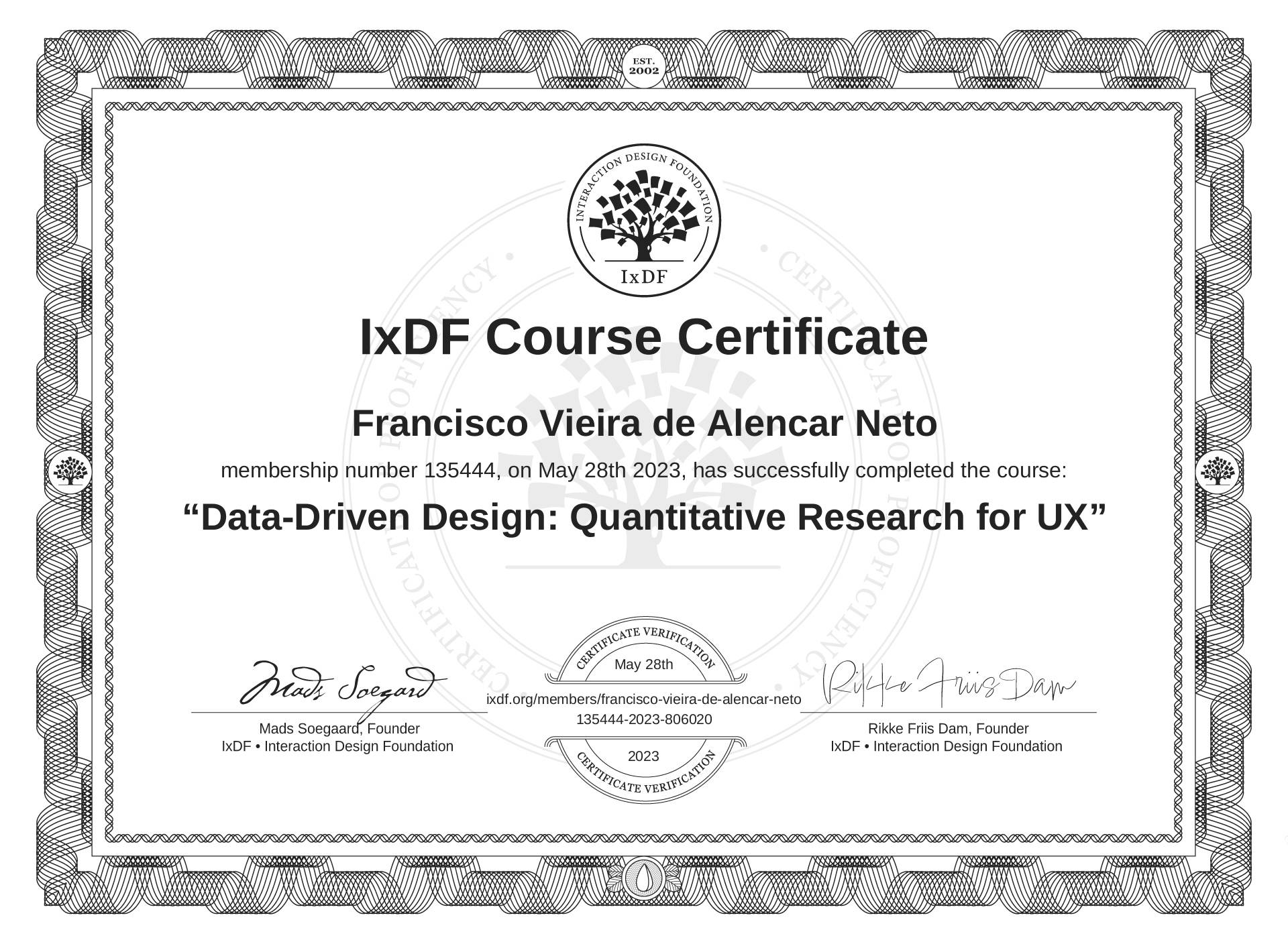 Francisco Vieira de Alencar Neto's IxDF Course Certificate: Data-Driven Design: Quantitative Research for UX