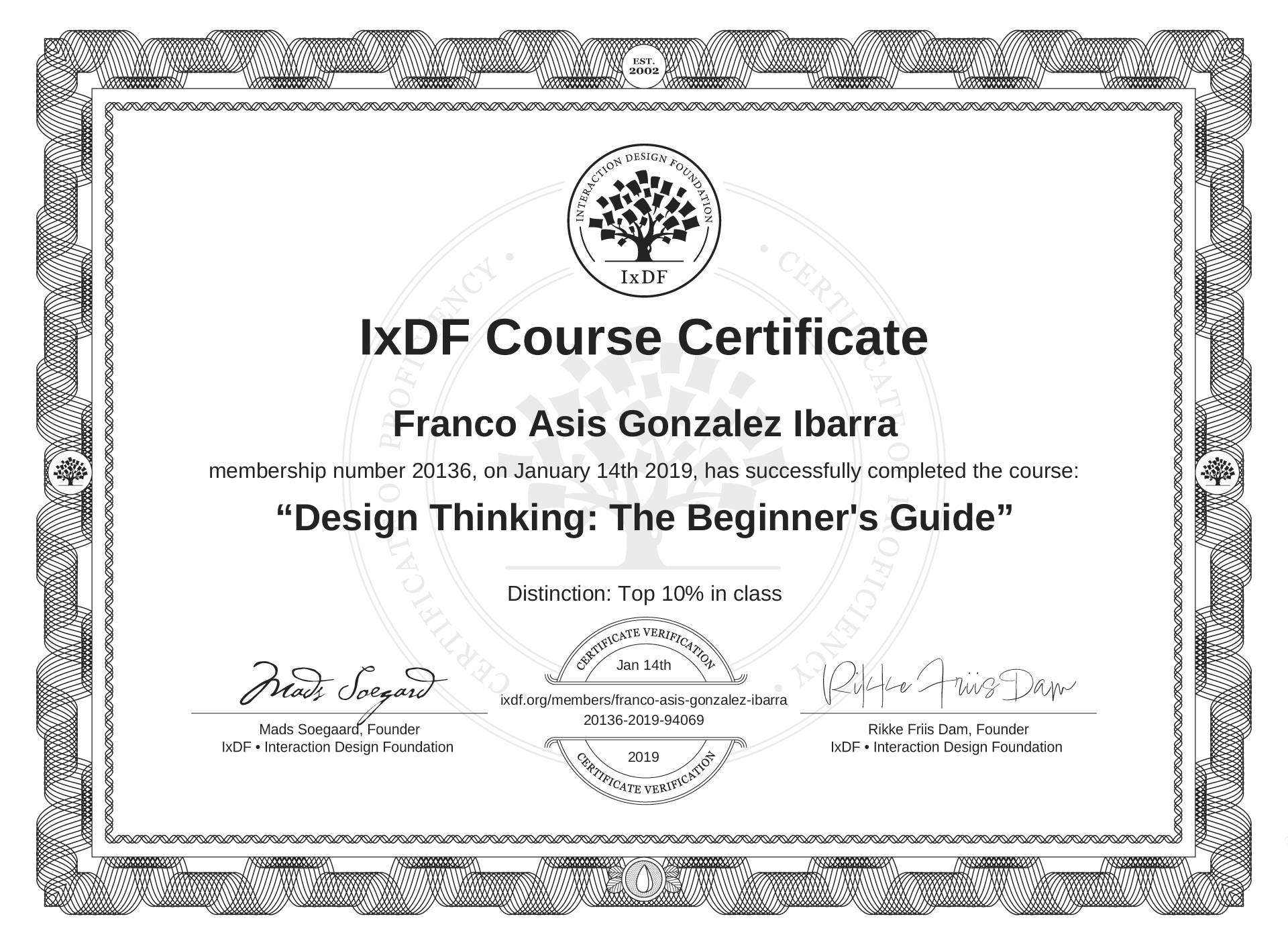 The IxDF Course Certificate above is awarded to Franco Asis González Ibarra with a Top 10% Distinction in formal recognition of their coursework surpassing the rigorous benchmarks of exceptional performance established by the IxDF Educational Codex.