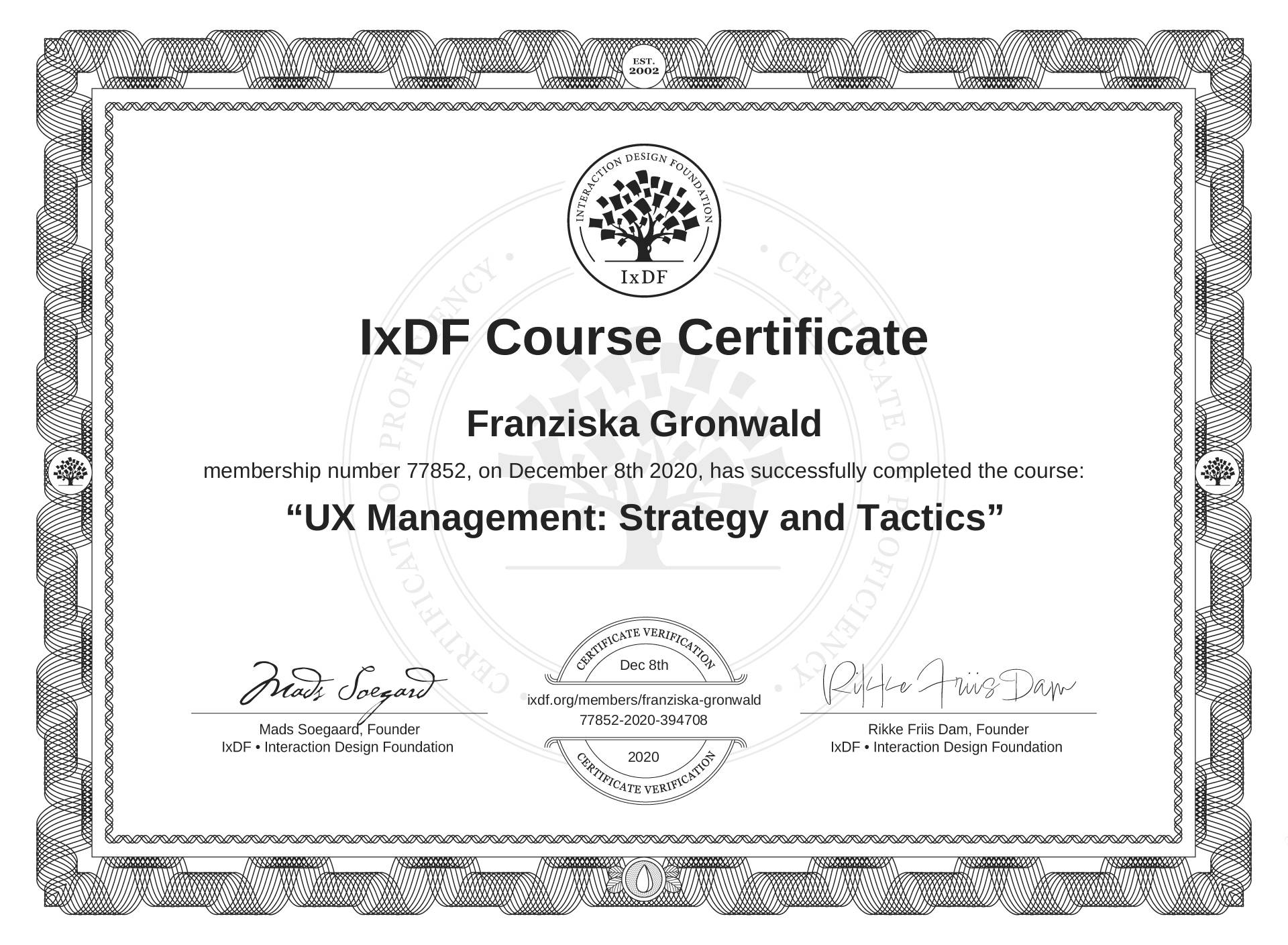 Franziska Gronwald's IxDF Course Certificate: UX Management: Strategy and Tactics