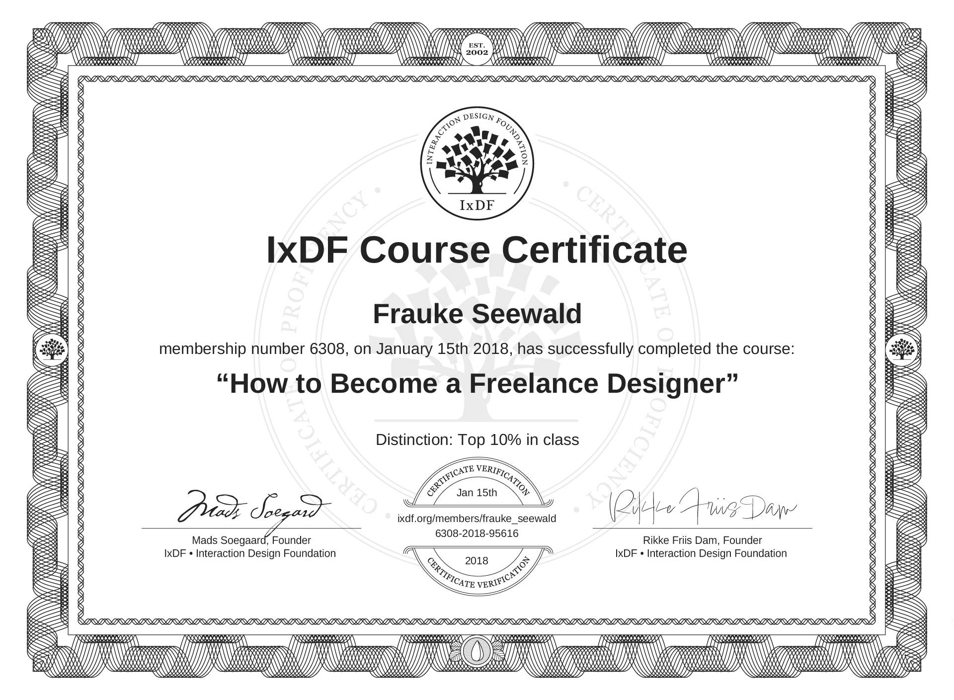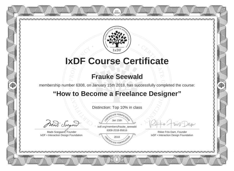 Frauke Seewald's IxDF Course Certificate: How to Become a Freelance Designer