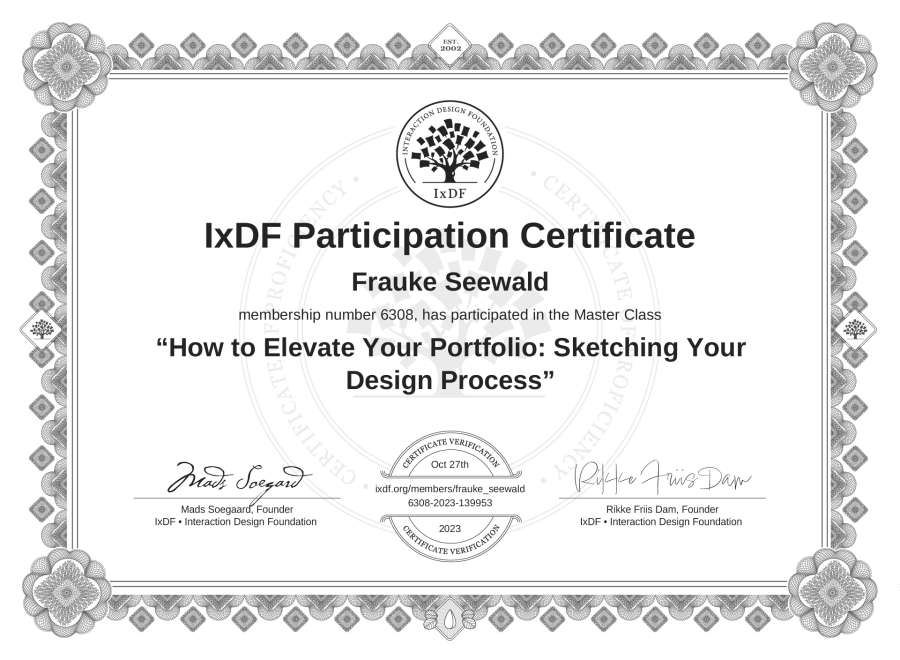 Frauke Seewald's IxDF Masterclass Certificate: How to Elevate Your Portfolio: Sketching Your Design Process