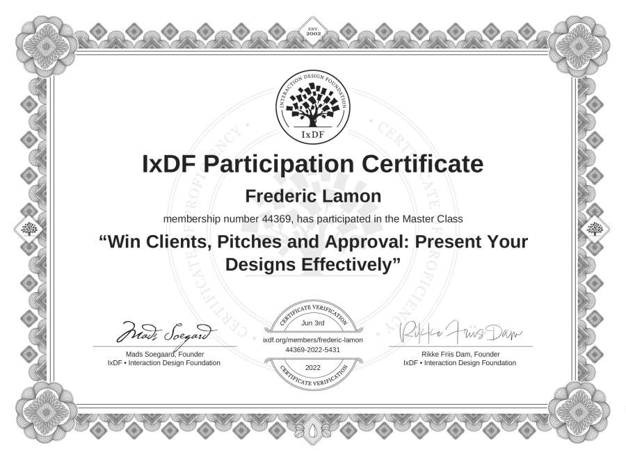 Frederic Lamon's IxDF Masterclass Certificate: Win Clients, Pitches and Approval: Present Your Designs Effectively