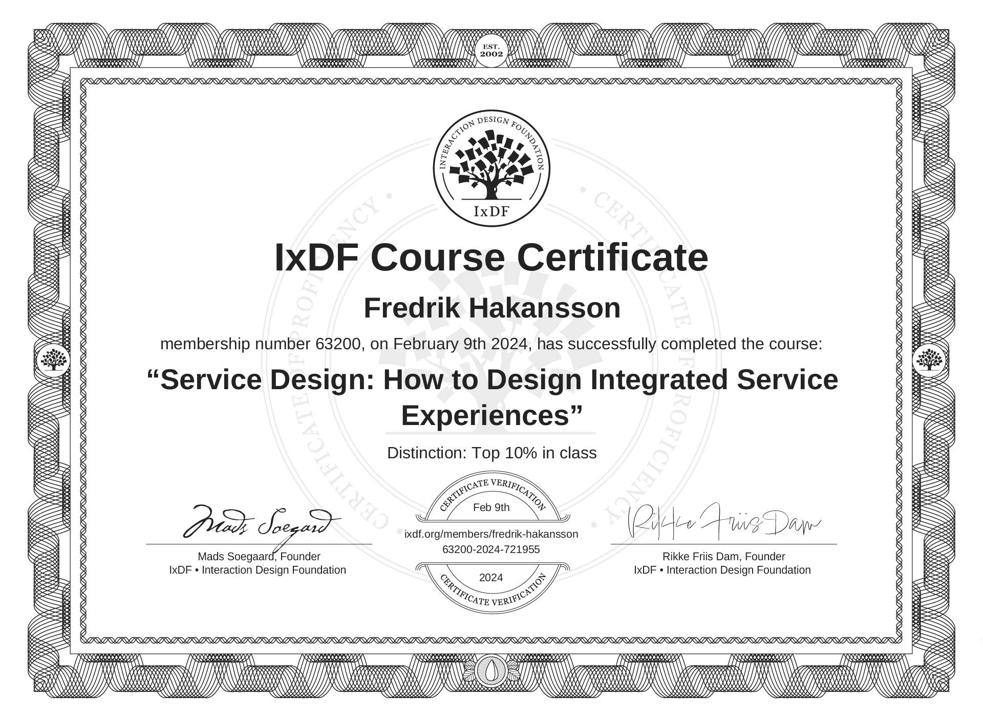 The IxDF Course Certificate above is awarded to Fredrik Håkansson with a Top 10% Distinction in formal recognition of their coursework surpassing the rigorous benchmarks of exceptional performance established by the IxDF Educational Codex.