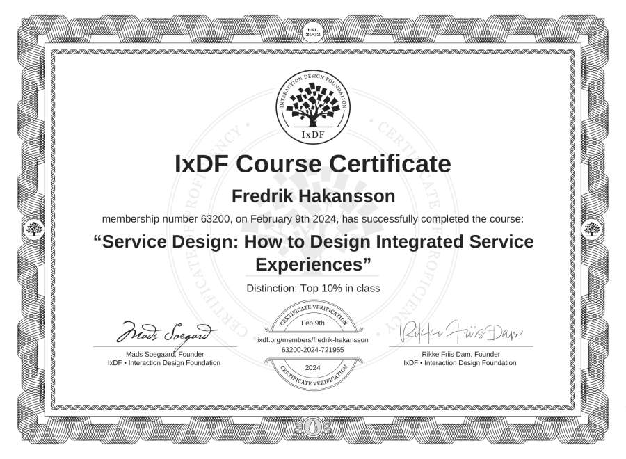 Fredrik Håkansson's IxDF Course Certificate: Service Design: How to Design Integrated Service Experiences