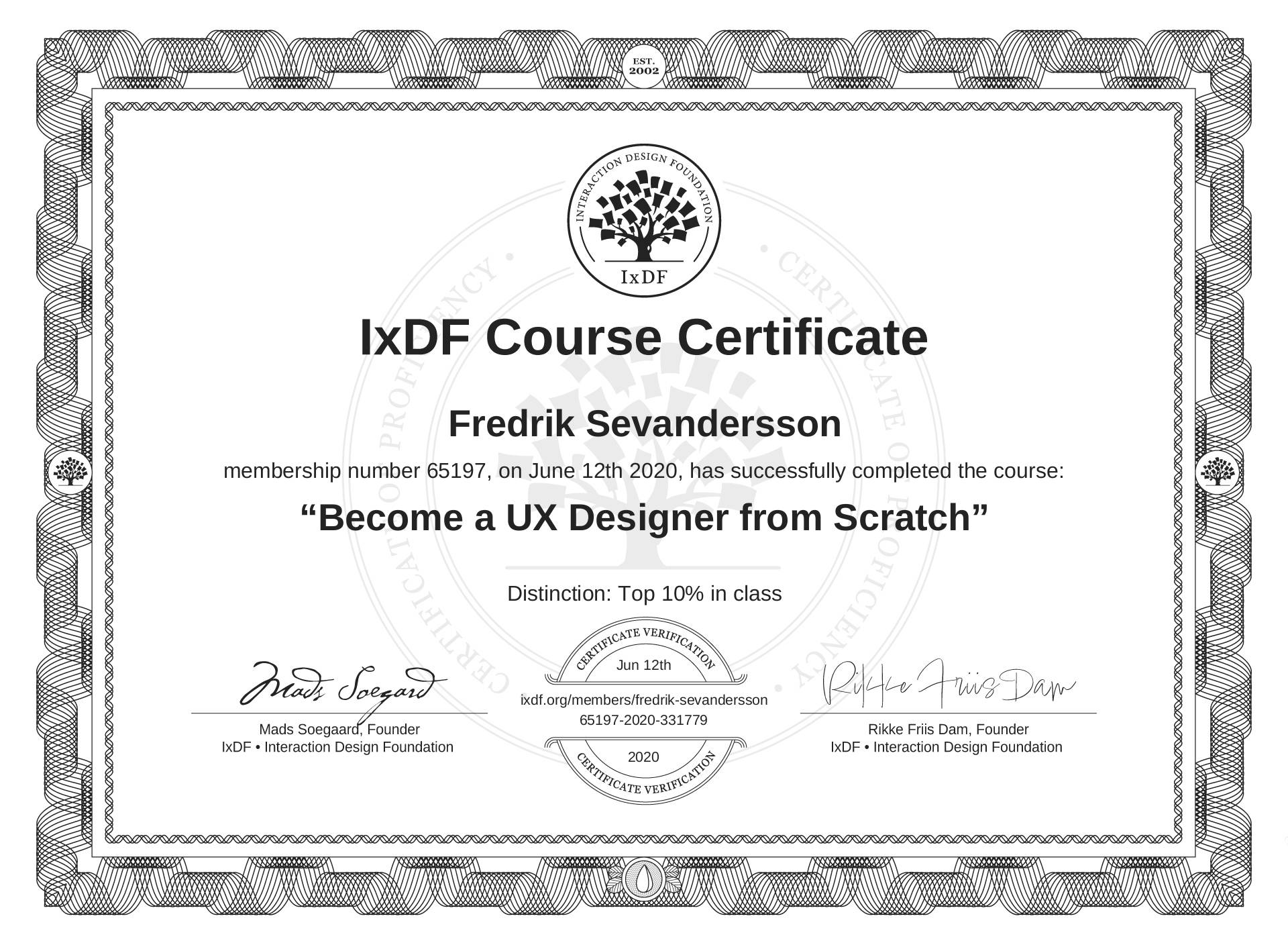 The IxDF Course Certificate above is awarded to Fredrik Sevandersson with a Top 10% Distinction in formal recognition of their coursework surpassing the rigorous benchmarks of exceptional performance established by the IxDF Educational Codex.