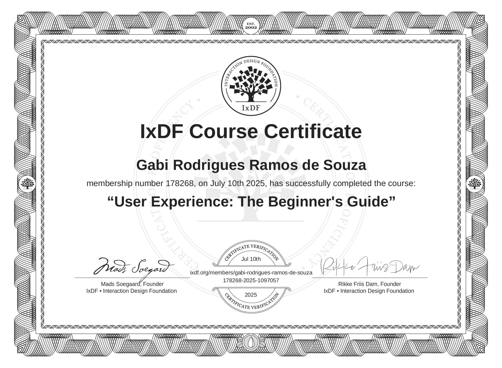Gabi Rodrigues Ramos de Souza's IxDF Course Certificate: User Experience: The Beginner's Guide