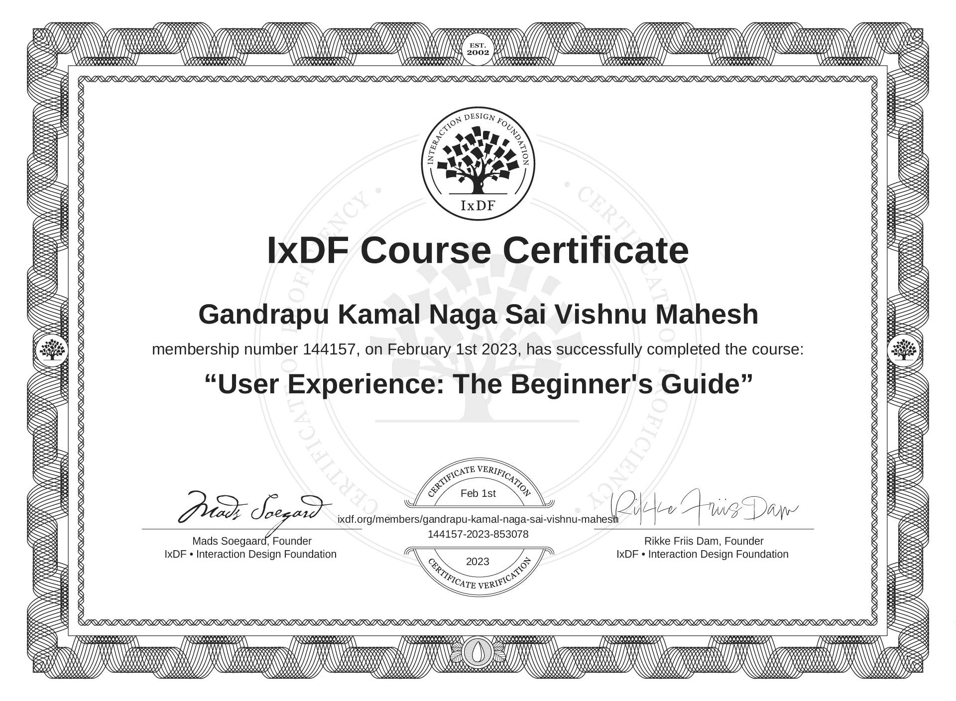 The IxDF Course Certificate above is awarded to Gandrapu Kamal Naga Sai Vishnu Mahesh in formal recognition of their coursework surpassing the rigorous benchmarks of exceptional performance established by the IxDF Educational Codex.