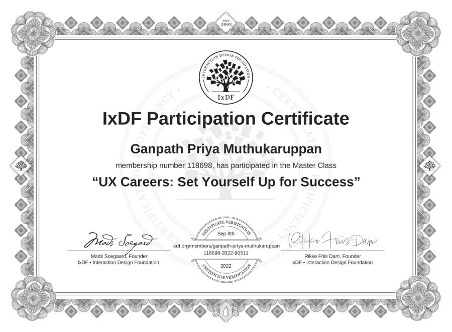 Ganpath Priya Muthukaruppan's IxDF Masterclass Certificate: UX Careers: Set Yourself Up for Success