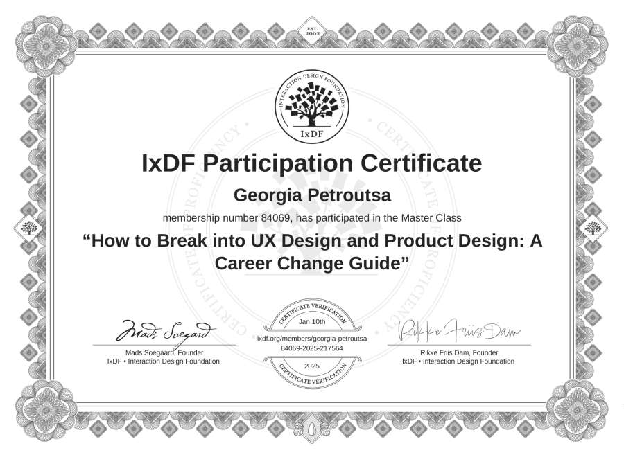 Georgia Petroutsa's IxDF Masterclass Certificate: How to Break into UX Design and Product Design: A Career Change Guide