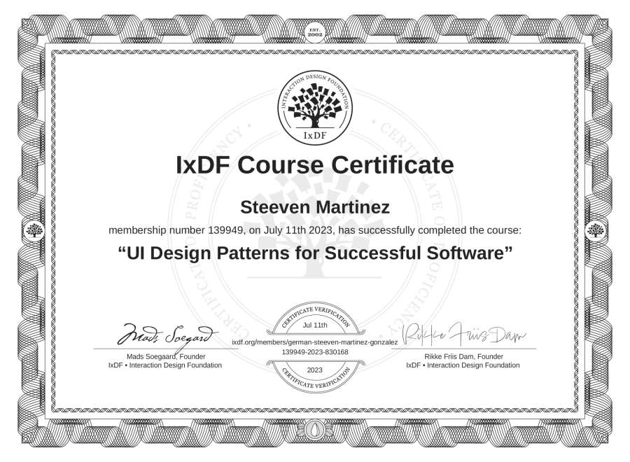 The IxDF Course Certificate above is awarded to Steeven Martinez in formal recognition of their coursework surpassing the rigorous benchmarks of exceptional performance established by the IxDF Educational Codex.