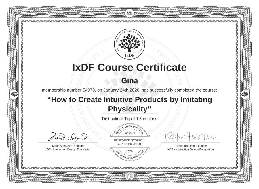 Gina's IxDF Course Certificate: How to Create Intuitive Products by Imitating Physicality