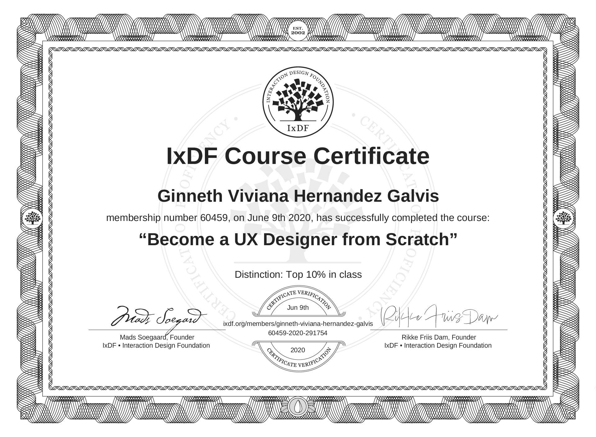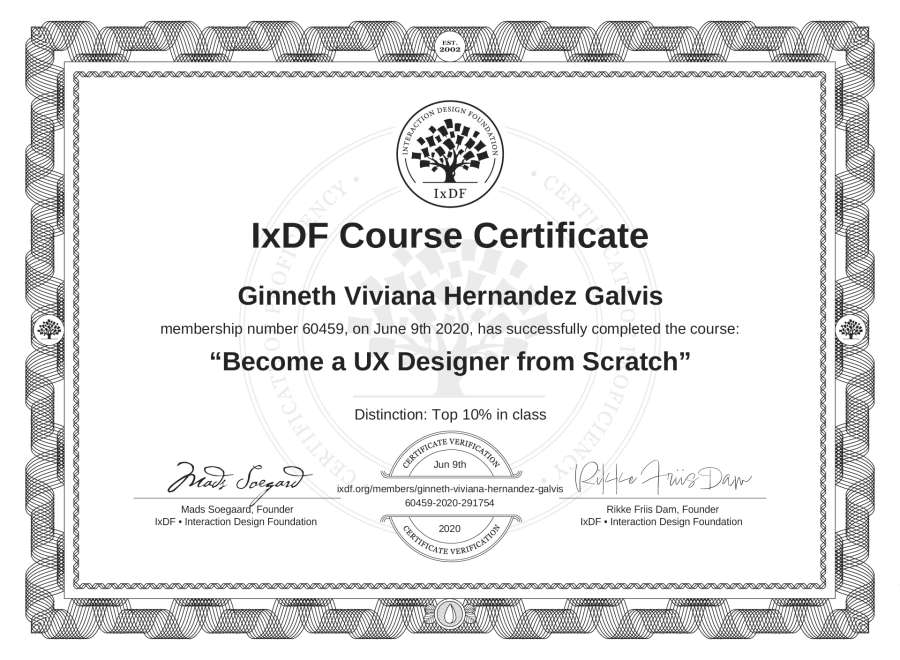 The IxDF Course Certificate above is awarded to Ginneth Viviana Hernández Galvis with a Top 10% Distinction in formal recognition of their coursework surpassing the rigorous benchmarks of exceptional performance established by the IxDF Educational Codex.
