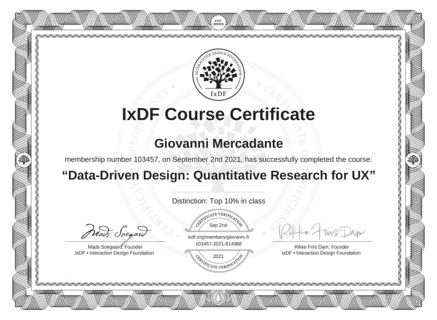 The IxDF Course Certificate above is awarded to Giovanni Mercadante with a Top 10% Distinction in formal recognition of their coursework surpassing the rigorous benchmarks of exceptional performance established by the IxDF Educational Codex.