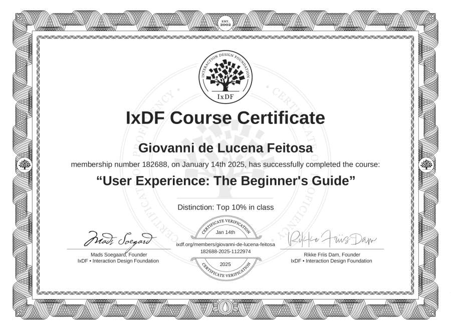 Giovanni de Lucena Feitosa's IxDF Course Certificate: User Experience: The Beginner's Guide