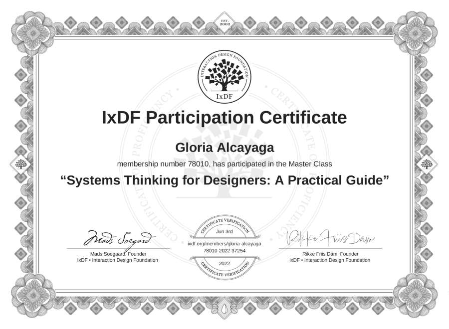 Gloria Alcayaga's IxDF Masterclass Certificate: Systems Thinking for Designers: A Practical Guide