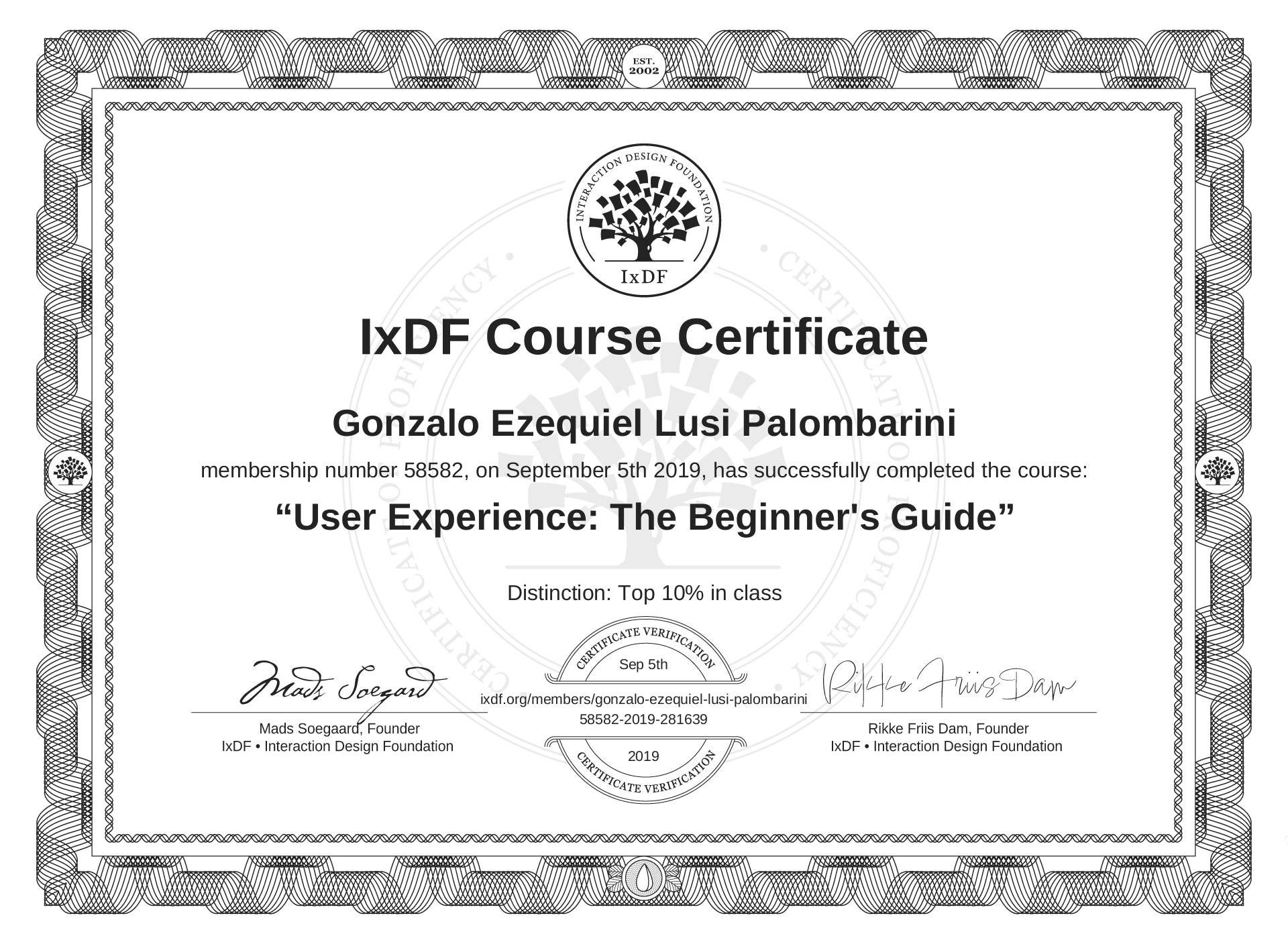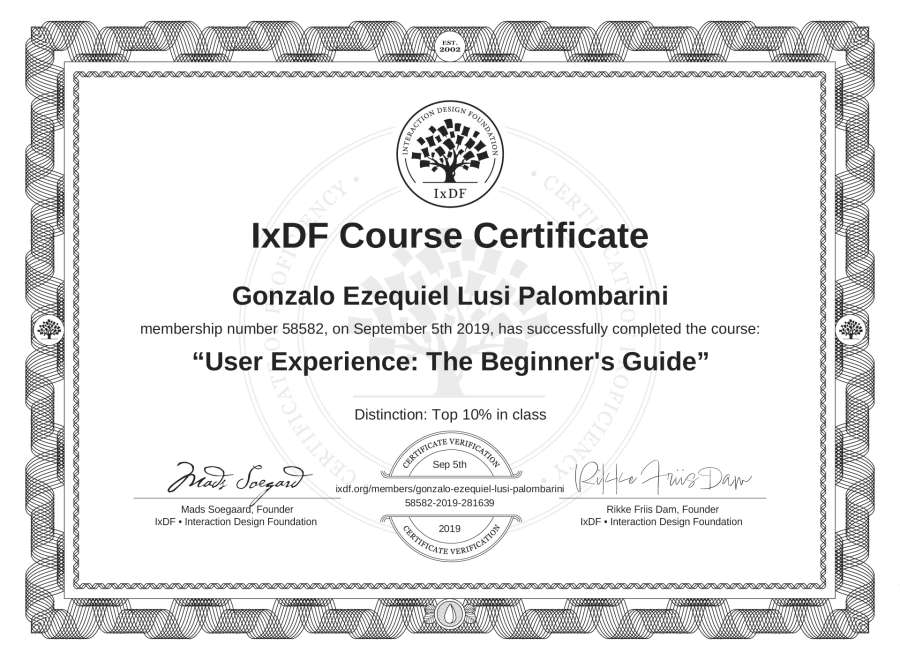 Gonzalo Ezequiel Lusi Palombarini's IxDF Course Certificate: User Experience: The Beginner's Guide