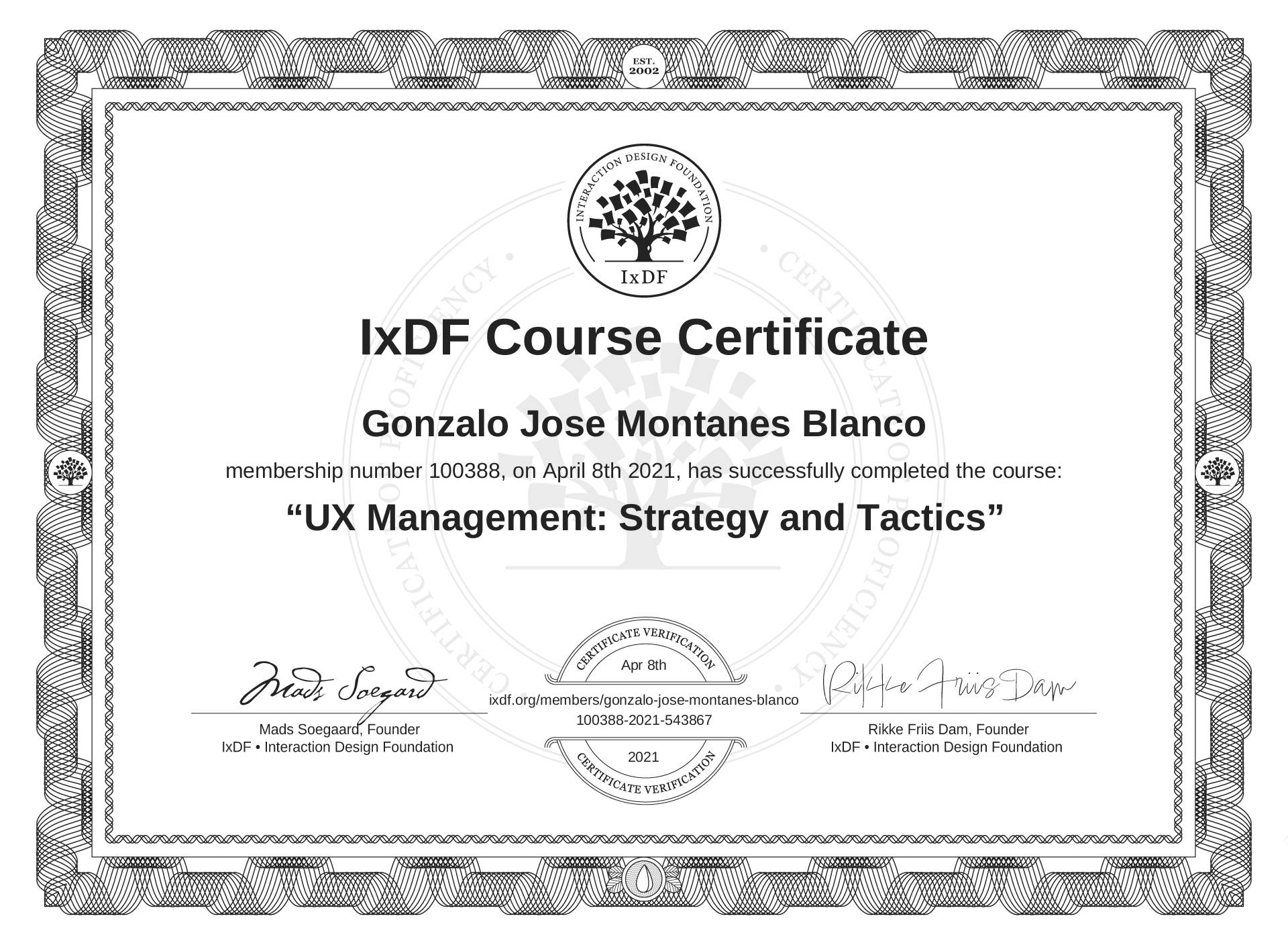 The IxDF Course Certificate above is awarded to Gonzalo José Montañés Blanco in formal recognition of their coursework surpassing the rigorous benchmarks of exceptional performance established by the IxDF Educational Codex.