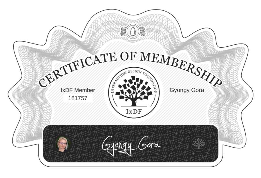 The Membership Certificate below verifies that Gyöngy Gora is a member of Interaction Design Foundation.