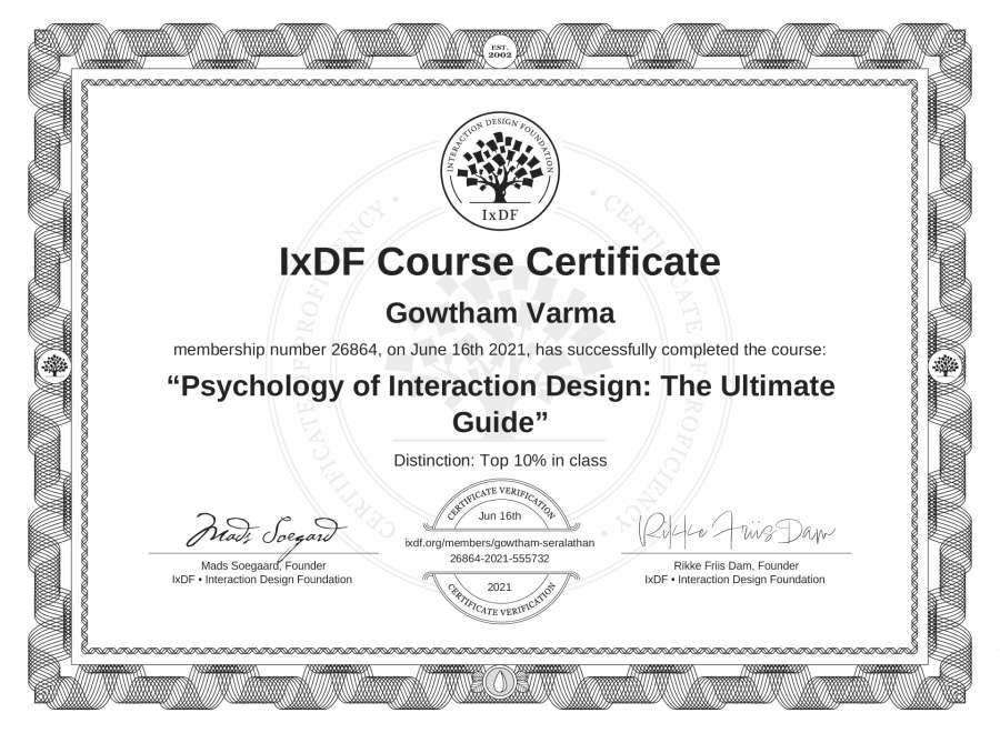 Gowtham Varma's IxDF Course Certificate: Psychology of Interaction Design: The Ultimate Guide