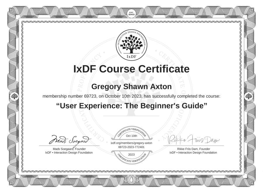 Gregory Shawn Axton's IxDF Course Certificate: User Experience: The Beginner's Guide