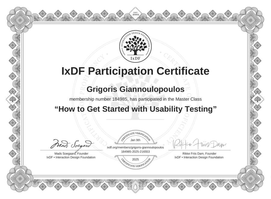 Grigoris Giannoulopoulos's IxDF Masterclass Certificate: How to Get Started with Usability Testing