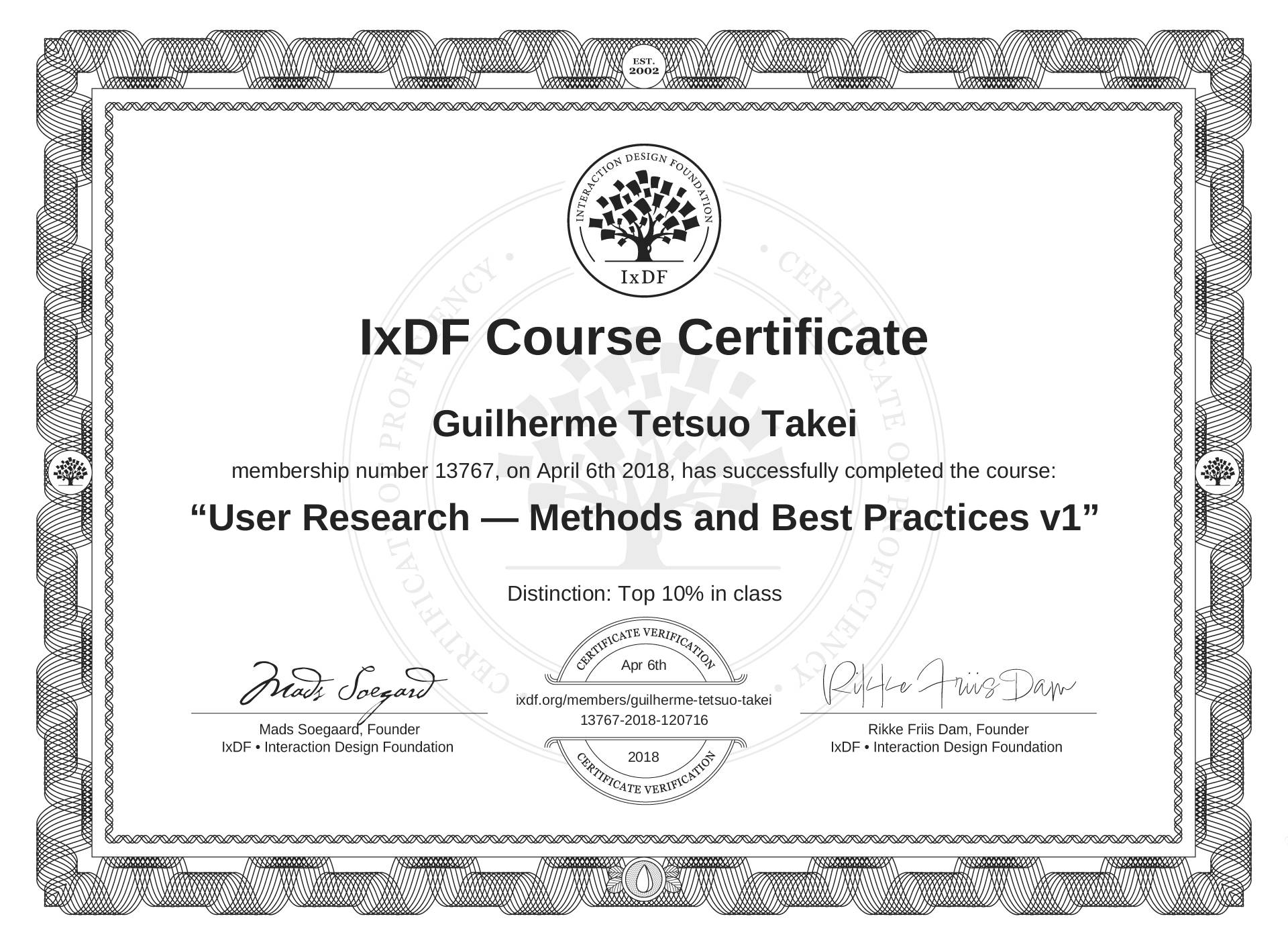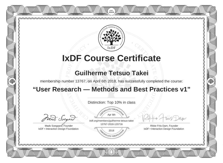 The IxDF Course Certificate above is awarded to Guilherme Tetsuo Takei with a Top 10% Distinction in formal recognition of their coursework surpassing the rigorous benchmarks of exceptional performance established by the IxDF Educational Codex.
