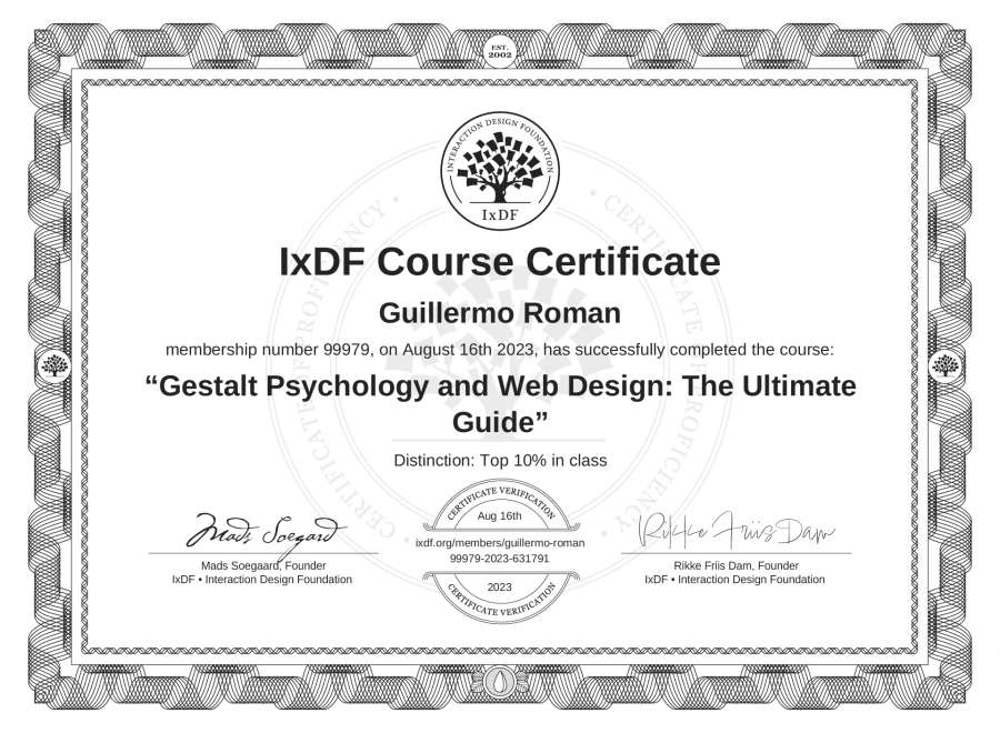 The IxDF Course Certificate above is awarded to Guillermo Roman with a Top 10% Distinction in formal recognition of their coursework surpassing the rigorous benchmarks of exceptional performance established by the IxDF Educational Codex.