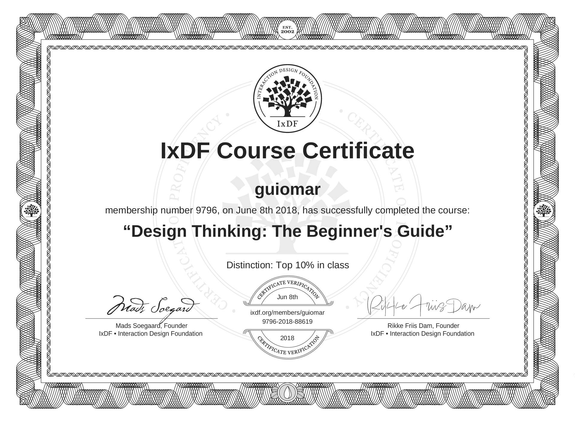 The IxDF Course Certificate above is awarded to guiomar with a Top 10% Distinction in formal recognition of their coursework surpassing the rigorous benchmarks of exceptional performance established by the IxDF Educational Codex.