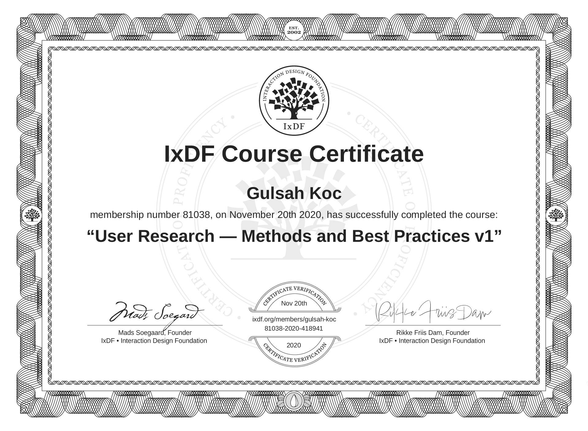Gulsah Koc's IxDF Course Certificate: User Research — Methods and Best Practices v1