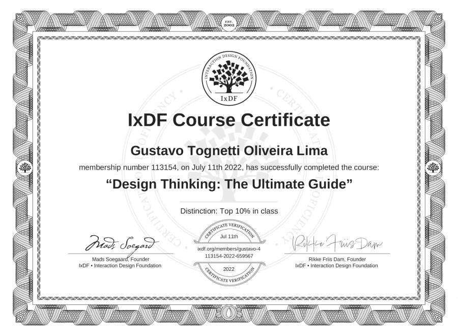 The IxDF Course Certificate above is awarded to Gustavo Tognetti Oliveira Lima with a Top 10% Distinction in formal recognition of their coursework surpassing the rigorous benchmarks of exceptional performance established by the IxDF Educational Codex.