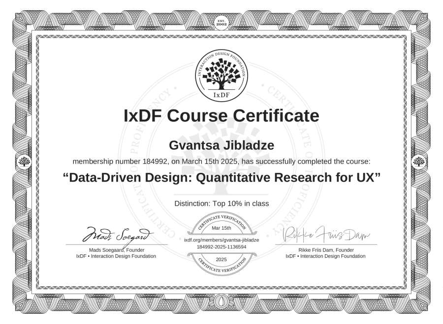 Gvantsa Jibladze's IxDF Course Certificate: Data-Driven Design: Quantitative Research for UX