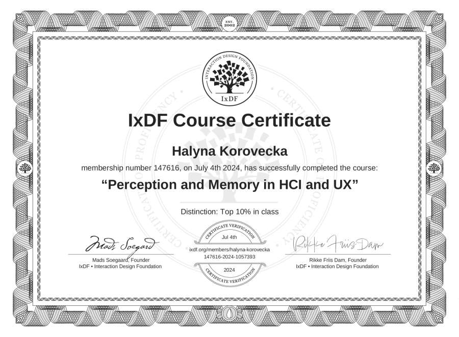 Halyna Korovecka's IxDF Course Certificate: Perception and Memory in HCI and UX