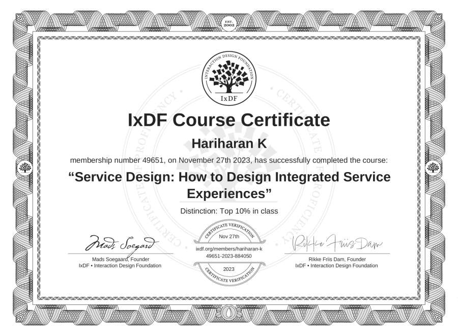 Hariharan K's IxDF Course Certificate: Service Design: How to Design Integrated Service Experiences