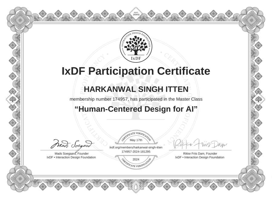 HARKANWAL SINGH ITTEN's IxDF Masterclass Certificate: Human-Centered Design for AI